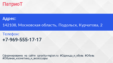 ПатриоТ по адресу 142108, Московская область, Подольск, Курчатова, 2 в дальнейшем Организация, размещена в следующих категориях: