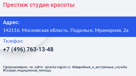 Престиж, студия красоты по адресу 142116, Московская область, Подольск, Мраморная, 2а в дальнейшем Организация, размещена в следующих категориях: