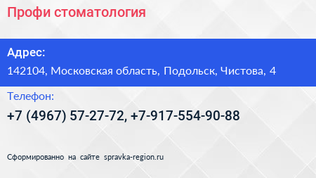 Профи, стоматология по адресу 142104, Московская область, Подольск, Чистова, 4 в дальнейшем Организация, размещена в следующих категориях: