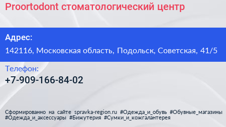 Proortodont, стоматологический центр по адресу 142116, Московская область, Подольск, Советская, 41/5 в дальнейшем Организация, размещена в следующих категориях: