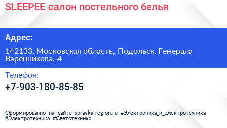SLEEPEE, салон постельного белья по адресу 142133, Московская область, Подольск, Генерала Варенникова, 4 в дальнейшем Организация, размещена в следующих категориях: