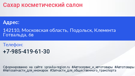 Сахар, косметический салон по адресу 142110, Московская область, Подольск, Клемента Готвальда, 6в в дальнейшем Организация, размещена в следующих категориях: