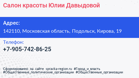 Салон красоты Юлии Давыдовой по адресу 142110, Московская область, Подольск, Кирова, 19 в дальнейшем Организация, размещена в следующих категориях: