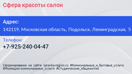 Сфера красоты, салон по адресу 142119, Московская область, Подольск, Ленинградская, 5 в дальнейшем Организация, размещена в следующих категориях:
