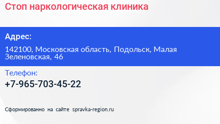 Стоп, наркологическая клиника по адресу 142100, Московская область, Подольск, Малая Зеленовская, 46 в дальнейшем Организация, размещена в следующих категориях:
