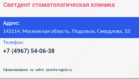 Светдент, стоматологическая клиника по адресу 142114, Московская область, Подольск, Свердлова, 33 в дальнейшем Организация, размещена в следующих категориях: