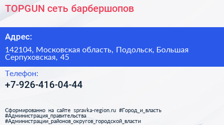 TOPGUN, сеть барбершопов по адресу 142104, Московская область, Подольск, Большая Серпуховская, 45 в дальнейшем Организация, размещена в следующих категориях: