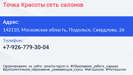 Точка Красоты, сеть салонов по адресу 142110, Московская область, Подольск, Свердлова, 26 в дальнейшем Организация, размещена в следующих категориях: