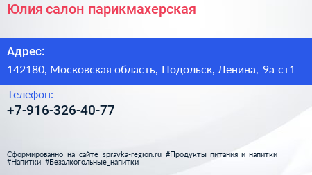 Юлия, салон-парикмахерская по адресу 142180, Московская область, Подольск, Ленина, 9а ст1 в дальнейшем Организация, размещена в следующих категориях:
