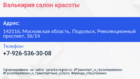 Валькирия, салон красоты по адресу 142116, Московская область, Подольск, Революционный проспект, 36/14 в дальнейшем Организация, размещена в следующих категориях: