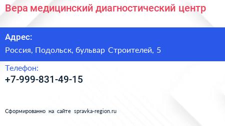 Вера, медицинский диагностический центр по адресу 5, бульвар Строителей, Жилой квартал «Домодедово парк», Домодедово, городской округ Домодедово, Московская область, Центральный федеральный округ, 142029, Россия в дальнейшем Организация, размещена в следующих категориях:
