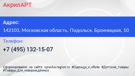 АкрилАРТ по адресу 142103, Московская область, Подольск, Бронницкая, 10 в дальнейшем Организация, размещена в следующих категориях: