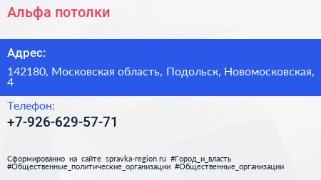 Альфа-потолки по адресу 142180, Московская область, Подольск, Новомосковская, 4 в дальнейшем Организация, размещена в следующих категориях: