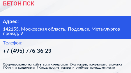 БЕТОН ПСК по адресу 142155, Московская область, Подольск, Металлургов проезд, 9 в дальнейшем Организация, размещена в следующих категориях: