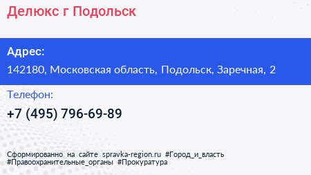 Делюкс, г. Подольск по адресу 142180, Московская область, Подольск, Заречная, 2 в дальнейшем Организация, размещена в следующих категориях: