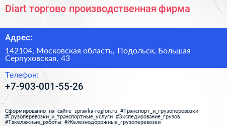 Diart, торгово-производственная фирма по адресу 142104, Московская область, Подольск, Большая Серпуховская, 43 в дальнейшем Организация, размещена в следующих категориях:
