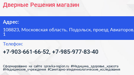 Дверные Решения, магазин по адресу 108823, Московская область, Подольск, проезд Авиаторов, 1 в дальнейшем Организация, размещена в следующих категориях: