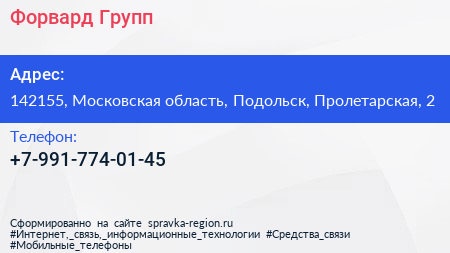 Форвард Групп по адресу 142155, Московская область, Подольск, Пролетарская, 2 в дальнейшем Организация, размещена в следующих категориях: