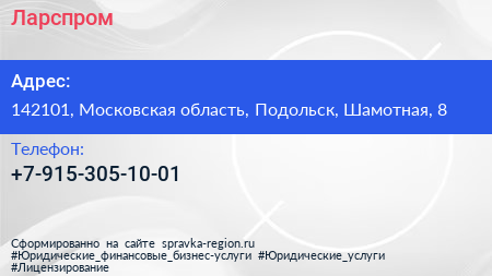 Ларспром по адресу 142101, Московская область, Подольск, Шамотная, 8 в дальнейшем Организация, размещена в следующих категориях: