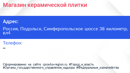 Магазин керамической плитки по адресу ТЦ «Хамелеон», вл4, Симферопольское шоссе (дублёр), Александровка, городской округ Подольск, Московская область, Центральный федеральный округ, 142116, Россия в дальнейшем Организация, размещена в следующих категориях: