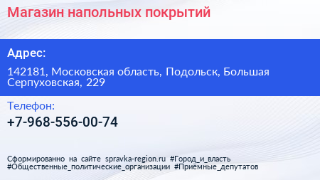 Магазин напольных покрытий по адресу 142181, Московская область, Подольск, Большая Серпуховская, 229 в дальнейшем Организация, размещена в следующих категориях: