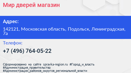 Мир дверей, магазин по адресу 142121, Московская область, Подольск, Ленинградская, 7а в дальнейшем Организация, размещена в следующих категориях: