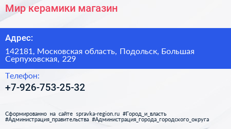 Мир керамики, магазин по адресу 142181, Московская область, Подольск, Большая Серпуховская, 229 в дальнейшем Организация, размещена в следующих категориях: