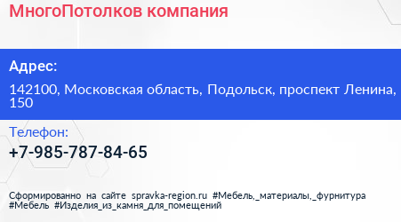 МногоПотолков, компания по адресу 142100, Московская область, Подольск, проспект Ленина, 150 в дальнейшем Организация, размещена в следующих категориях: