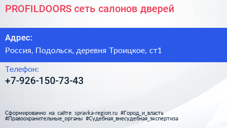 PROFILDOORS, сеть салонов дверей по адресу Стройрынок Молоток - 1, Варшавское шоссе, Троицкое, Посёлок дорожно-ремонтного пункта-3, Краснопахорский район, Москва, Центральный федеральный округ, 142145, Россия в дальнейшем Организация, размещена в следующих категориях: