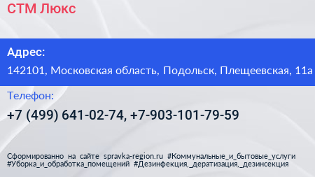 СТМ-Люкс по адресу 142101, Московская область, Подольск, Плещеевская, 11а в дальнейшем Организация, размещена в следующих категориях: