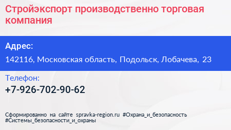 Стройэкспорт, производственно-торговая компания по адресу 142116, Московская область, Подольск, Лобачева, 23 в дальнейшем Организация, размещена в следующих категориях: