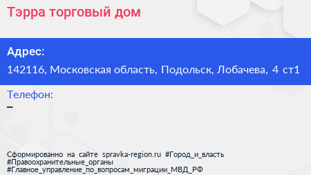 Тэрра, торговый дом по адресу 142116, Московская область, Подольск, Лобачева, 4 ст1 в дальнейшем Организация, размещена в следующих категориях: