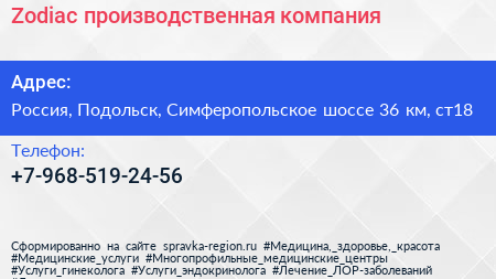 Zodiac, производственная компания по адресу Строительный рынок "Покров", Симферопольское шоссе (дублёр), Сельхозтехника, городской округ Подольск, Московская область, Центральный федеральный округ, 142116, Россия в дальнейшем Организация, размещена в следующих категориях: