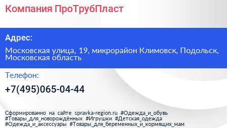 Компания «ПроТрубПласт» по адресу Московская улица, 19, микрорайон Климовск, Подольск, Московская область в дальнейшем Организация, размещена в следующих категориях: