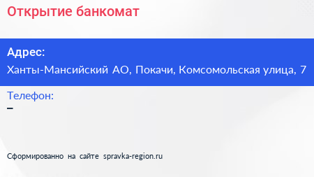 Открытие, банкомат по адресу Ханты-Мансийский АО, Покачи, Комсомольская улица, 7 в дальнейшем Организация, размещена в следующих категориях: