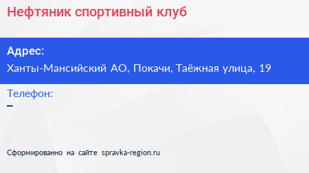 Нефтяник, спортивный клуб по адресу Ханты-Мансийский АО, Покачи, Таёжная улица, 19 в дальнейшем Организация, размещена в следующих категориях: