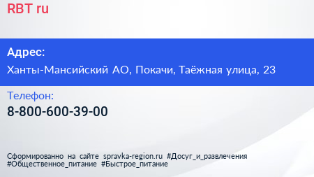 RBT.ru по адресу Ханты-Мансийский АО, Покачи, Таёжная улица, 23 в дальнейшем Организация, размещена в следующих категориях: