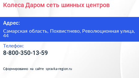 Колеса Даром, сеть шинных центров по адресу Самарская область, Похвистнево, Революционная улица, 44 в дальнейшем Организация, размещена в следующих категориях: