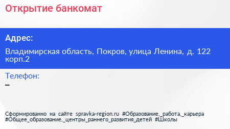 Открытие, банкомат по адресу Владимирская область, Покров, улица Ленина, д. 122 корп.2 в дальнейшем Организация, размещена в следующих категориях: