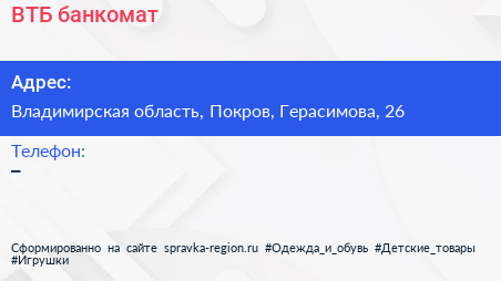 ВТБ, банкомат по адресу Владимирская область, Покров, Герасимова, 26 в дальнейшем Организация, размещена в следующих категориях: