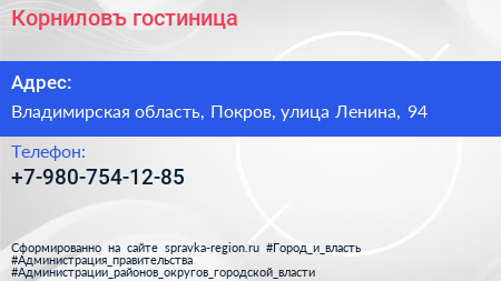 Корниловъ, гостиница по адресу Владимирская область, Покров, улица Ленина, 94 в дальнейшем Организация, размещена в следующих категориях:
