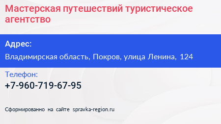 Мастерская путешествий, туристическое агентство по адресу Владимирская область, Покров, улица Ленина, 124 в дальнейшем Организация, размещена в следующих категориях: