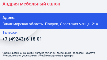 Андрия, мебельный салон по адресу Владимирская область, Покров, Советская улица, 21а в дальнейшем Организация, размещена в следующих категориях: