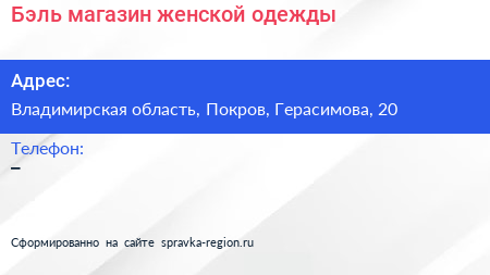 Бэль, магазин женской одежды по адресу Владимирская область, Покров, Герасимова, 20 в дальнейшем Организация, размещена в следующих категориях: