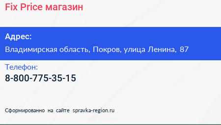 Fix Price, магазин по адресу Владимирская область, Покров, улица Ленина, 87 в дальнейшем Организация, размещена в следующих категориях: