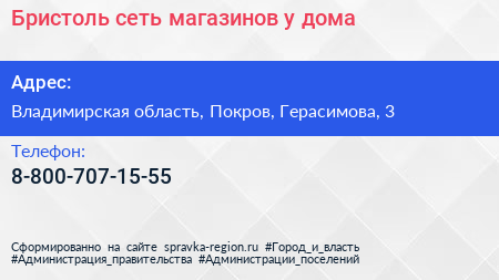 Бристоль, сеть магазинов у дома по адресу Владимирская область, Покров, Герасимова, 3 в дальнейшем Организация, размещена в следующих категориях:
