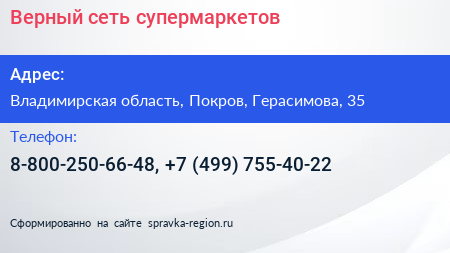 Верный, сеть супермаркетов по адресу Владимирская область, Покров, Герасимова, 35 в дальнейшем Организация, размещена в следующих категориях: