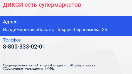 ДИКСИ, сеть супермаркетов по адресу Владимирская область, Покров, Герасимова, 26 в дальнейшем Организация, размещена в следующих категориях: