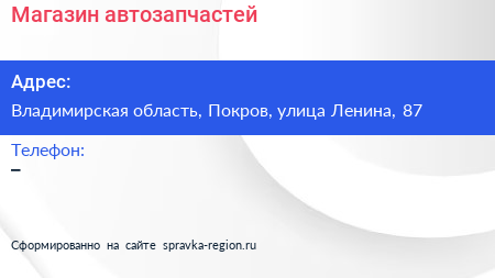 Магазин автозапчастей по адресу Владимирская область, Покров, улица Ленина, 87 в дальнейшем Организация, размещена в следующих категориях: