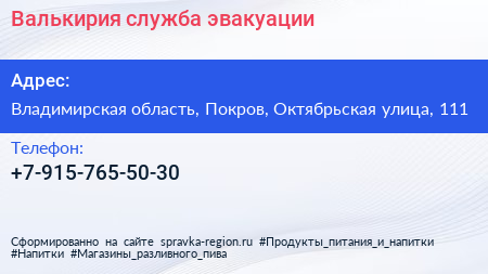 Валькирия, служба эвакуации по адресу Владимирская область, Покров, Октябрьская улица, 111 в дальнейшем Организация, размещена в следующих категориях: